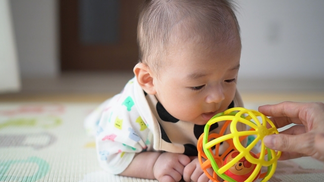 カラカラと音のなるラトルのようなものを鳴らしてあげましょう。